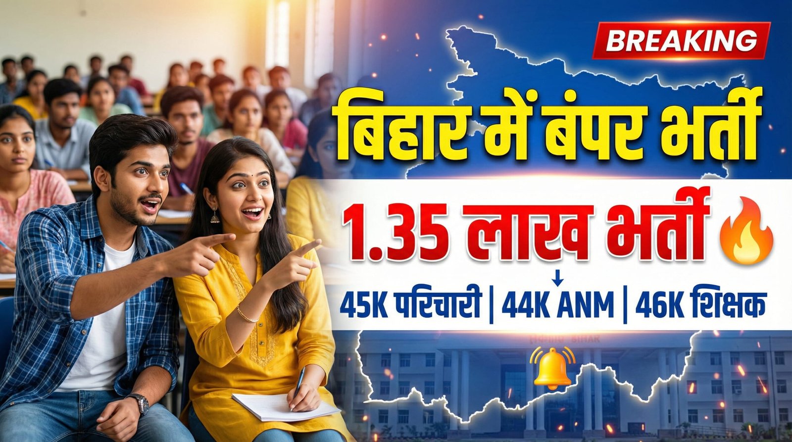Bihar New Vacancy 2026: बिहार में सरकारी नौकरी की तैयारी करने वाले युवाओं के लिए वर्ष 2026 बहुत ही अच्छा साबित होगा। राज्य सरकार ने विधानसभा में जानकारी देते हुए बताया है कि शिक्षा और स्वास्थ्य विभाग सहित विभिन्न क्षेत्रों में 1.35 लाख से अधिक पदों पर भर्ती प्रक्रिया को सुरु कर दिया है।